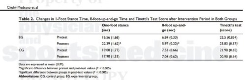 Η CG δεν έδειξε σημαντικές διαφορές μεταξύ pretest και post-test. Δεν βρέθηκαν σημαντικές διαφορές μεταξύ ομάδων στο pretest. Όμως, στο post-test η EG είχε υψηλότερη βαθμολογία στο τεστ Tinetti από την CG (P = 0,003).